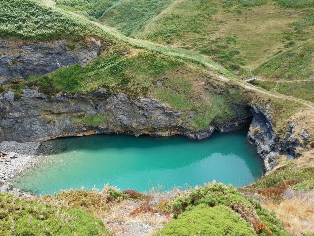 Located near Ceibwr Bay, around ten miles west of Mwnt, 5 miles west of Cardigan, the Witches Cauldron has clear, green and iridescent water on sunny days.